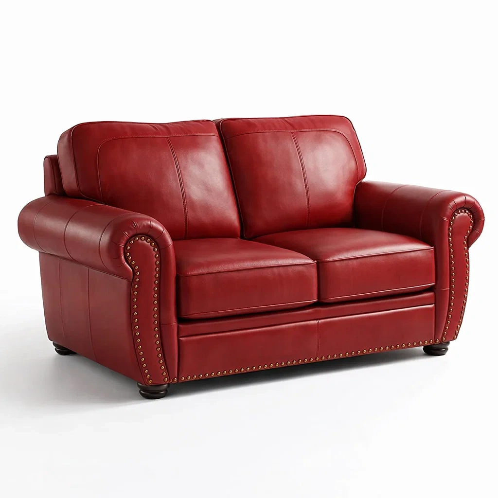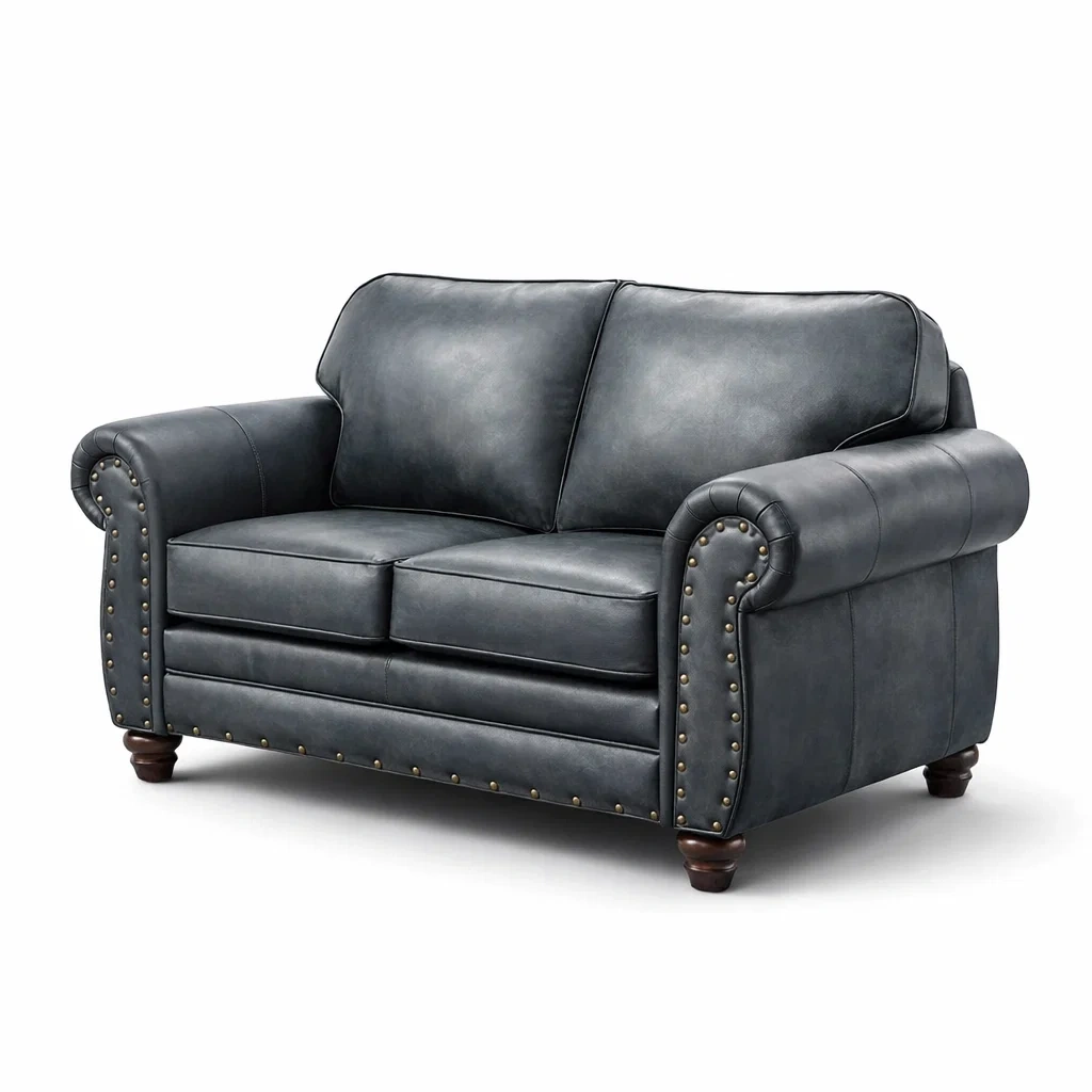 Canapé deux places en similicuir gris avec accoudoirs roulés